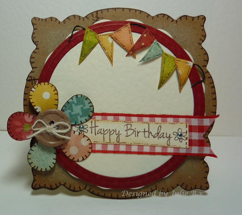 A few die cuts, some layers raised on foam, some embossing and inking, some nail heads and a shaped sentiment pretty much completes the card. except for some ribbon, twine and a lovely big button.